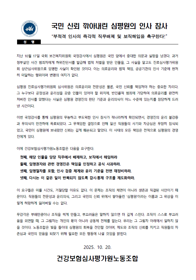 노동과세계 “공공성, 노동권 존중 철학 가진 국민연금공단 이사장 선임돼야” 새롭게 선임될 국민연금공단 이사장은 제도, 기관 관리, 기금 운용의 균형을 가진 인물이자 공공성, 노동권 존중의 철학을 가진 인물이어야 한다는 목소리가 모였다. 민주노총, 참여연대, 공공운수노조, 공공운수노조 국민연금지부가 30일 오전 10시 30분 용산 대통령실 앞에서 기자회견을 개최하고 이같이 외쳤다.내달 5일까지 신… 2025-10-30 11:58:18